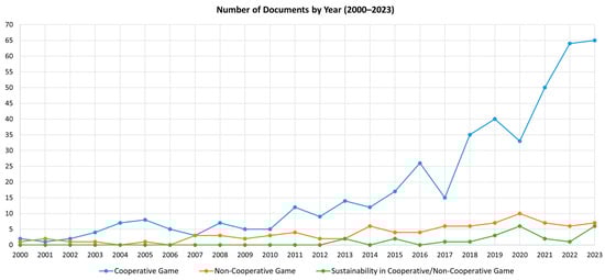 In order to provide a brief overview and visualization of the direction and recent research trends of the literature, a simple bibliometric analysis is performed in this section. The most relevant keywords associated with key aspects of game theory, energy trading, and sustainability were selected through an article title, abstract, and keyword search using the Scopus database. This search contained a high degree of restriction in the selection of documents, meaning that it only included works related to energy trading and management in power systems containing the terms “coalitional/cooperative game” or “non-cooperative game” in their title, abstract, and keywords. Because of the need to achieve more sustainable electricity markets and communities, literature works containing terms related to the concept of sustainability were also included in the analysis. The number and percentage of peer-reviewed documents published between the years 2000 and 2023 is presented in Figure 1 and Figure 2, respectively.