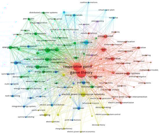Map of the most relevant keywords related to game theory, energy trading, and sustainability using VOSviewer with association strength normalization method.