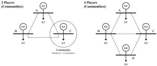 To understand the use and application of coalitional games in P2P energy trading, it is important to briefly explain some definitions and solution concepts. A coalitional game with transferable utility (TU) is given by a pair that specifies a cost for every coalition, where is a finite set of players and a subset of is a coalition [9,10]. In practical applications, it can be impossible or difficult to properly quantify the value of cooperation as a transferable unit such as profits or costs. In many cases, the outcome of cooperation can also be multivalued, being simultaneously represented through profits or cost savings, carbon emission reduction, and power loss mitigation [9]. The coalitional function of the game that associates every coalition with a real number or value is given by with the number of possible player coalitions or scenarios being , which excludes the scenario corresponding to a coalition without players [59]. The largest possible coalition that contains all players is known as the grand coalition, while the remaining coalitions can be called minor coalitions. In general, coalitional games can be formulated as profit games or cost games [10]. In a profit game, the value associated with a coalition represents the profit that players can obtain by cooperating with one another, allocating a mutual gain or payoff among them. On the other hand, in a cost game, the same value represents the cost players may have to pay collectively through cooperation, resulting in a mutual cost reduction and allocation of the total cost associated with their coalition [9,10].