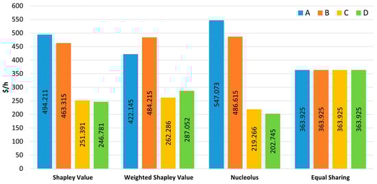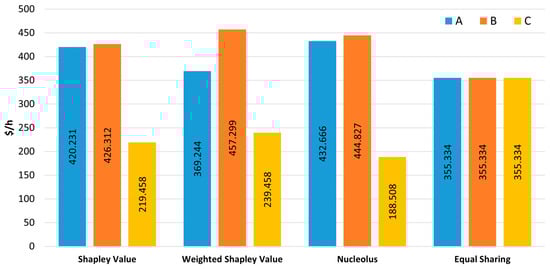 The Nucleolus can be used to guarantee that all excess allocated, i.e., dissatisfaction or satisfaction, is minimized or maximized among all coalitions [10,59]. More specifically, in an approach involving benefits, an imputation vector belongs to the Core of a game only if all the excesses obtained are negative or zero [10]. This makes the Nucleolus capable of finding a solution within the Core whenever it is proven to be non-empty [9,10,59]. Although the Nucleolus is a more complex solution concept to compute, it can provide the best allocation solution under min–max criteria [10]. It possesses properties that may constitute an advantage over the Shapley value given that it is not empty even if the Core of the game is an empty set. Moreover, the Nucleolus not only satisfies the properties of efficiency, symmetry, additivity, and null player, but also decreases the overall level of dissatisfaction of the least satisfied coalitions while ensuring coalition stability [9,10]. While this solution concept may be preferred over the Shapley value in certain cases, some authors may consider it to be relatively unfair when compared to the former as it allocates larger profits to the most dissatisfied coalitions without considering the individual contributions of players [9]. In [59], the authors discuss the most common mistakes in computing the Nucleolus and illustrate them using five examples, including an example of an allocation problem in electricity markets. This can be useful to avoid such mistakes when computing the Nucleolus solution concept in coalitional games involving more practical applications.