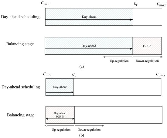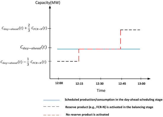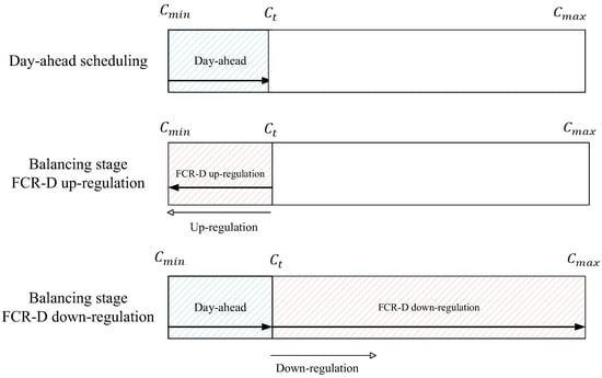 Reserve units offer their capacity to balancing markets in exchange for compensation. During periods of oversupply (demand exceeding supply), these units provide a downward reserve (down-regulation) by either increasing electricity consumption or decreasing generation. Conversely, during periods of undersupply (higher demand than supply), reserve units provide an upward reserve (up-regulation) by reducing electricity consumption or ramping up electricity generation. As the gate-closure time of the FCR market (18:30 EET time zone in the hourly market one day before the operation day (D-1)) takes place after the day-ahead market trades have been published (14:00 EET time zone in day D-1) [9], it is then known exactly how much of the capacity from a reserve unit has been tied to the day-ahead market (the day-ahead scheduling stage). Hence, after the day-ahead scheduling stage, the operator can offer the available capacity from the reserve units to the balancing markets.