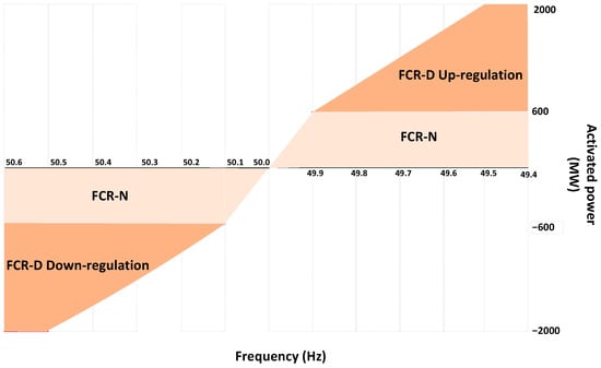 To create a more accurate model, 15 min granularity in the balancing market was considered in this study. Figure 6 depicts the schematic of a reserve unit when providing, for example, FCR in the market with 15 min granularity. The local measured frequency in 2019, gathered from [32], was used in the 15 min resolution to model the activation of the reserve units in FCR markets, using Equations (4)–(6) [21].