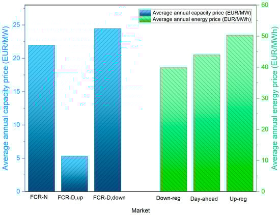 The TSO compensates reserve providers for keeping their reserve capacity on standby for activation. This payment, known as the capacity payment (or capacity fee), is computed as the multiplication of the accepted capacity from the auction by the realized capacity price for that specific hour. In addition, providers receive an activation payment (termed the energy fee) based on the actual amount of energy activated. The calculation of the energy fee involves multiplying the activated energy in the respective balancing market by the upward/downward balancing price, adhering to the one-price system. In this system, the purchase and sales prices of the imbalance energy are the same [9]. During periods of up-regulation, the price of the imbalance energy matches the up-regulation price, and during down-regulation, it equates to the down-regulation price. In hours with no regulation, the imbalance energy price is the Finnish day-ahead price. Table 1 in the study showcases the various mechanisms of this pricing system [9]. Figure 5 presents a comparison of the average capacity prices in the FCR-N and FCR-D hourly markets against the average prices for down-regulation, up-regulation, and spot prices in 2019 [24,29].