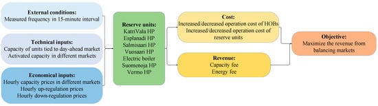where is the capacity of a reserve unit tied to the day-ahead market (day-ahead scheduling stage) and is the hourly day-ahead prices gathered from Nordpool [26]. , , and are the capacity prices in the corresponding markets [9]. and are the activated up-regulation and down-regulation capacities in each market during 15 min intervals multiplied by the up-regulation balancing prices of the corresponding hour, , and down-regulation price, , respectively. The net profit for each reserve unit gained from each of the mentioned markets is the sum of the capacity and energy fees. The net profit for each city’s DHN operator from participating in the balancing markets was obtained through the sum of the profits from all the reserve units within the city’s DHN and the change in the operation cost of the HOBs resulting from increasing or decreasing their production level to compensate for the heat imbalances after activating the reserve capacities. Figure 7 summarizes the inputs and outputs used in the simulation during balancing market participation.