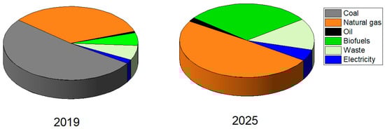 The share of fuel consumption in the case study DHN in 2019 and 2025 (2019 results indicate real case study fuel consumption, while 2025 results illustrate the simulation results).