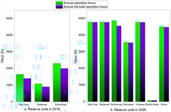 Annual operation hours and annual full-load operation hours of the reserve units in the day-ahead scheduling in: (a) 2019 and (b) 2025.