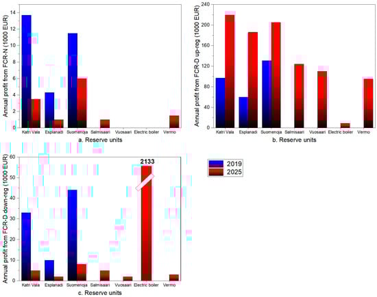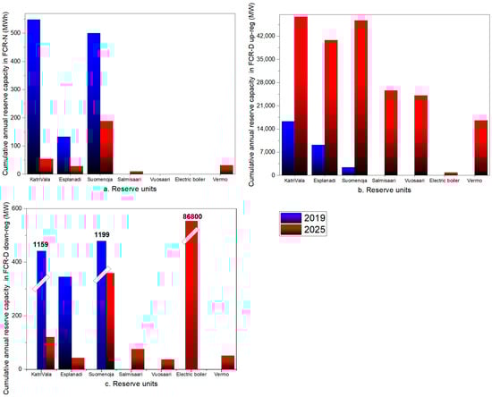 Figure 10 illustrates the cumulative available reserve capacity of each reserve unit throughout the year, calculated by multiplying the unit’s available reserve capacity (calculated with Equations (1)–(3)) by the total number of hours it is available for operation in the day-ahead scheduling stage. As discussed in Section 2.2, when a reserve unit operates at maximum capacity in the day-ahead stage, it is not available for FCR-N or FCR-D down-regulation markets. Therefore, units with a higher ratio of full-load operating hours to total operating hours in the day-ahead stage, such as Katri Vala, Esplanadi, and Suomenoja HPs in 2025 (see Figure 9b), exhibit lower available reserve capacity for FCR-N or FCR-D down-regulation markets (see Figure 10a,c). The limited availability of reserve capacity from Vuosaari, Salmisaari, and Vermo HPs in 2025 for FCR-N and FCR-D down-regulation markets stems from their near-constant operation at full capacity in the day-ahead stage (see Figure 9b).