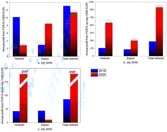 The cumulative annual net profit for each city DHN from: (a) FCR-N, (b) FCR-D up-regulation, and (c) FCR-D down-regulation markets in 2019 and 2025.