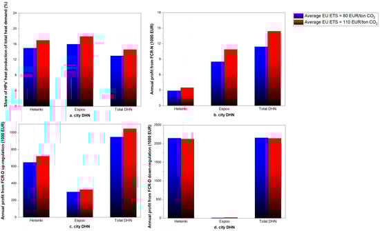 Given the intricate and uncertain nature of future energy market developments, it is crucial to pinpoint the primary factors influencing the modeling outcomes. Among these factors, electricity prices and fuel costs hold significant sway, with increasing EU ETS prices particularly impacting fuel costs for power plant operators [28]. To address these complexities, a sensitivity analysis was conducted, varying the electricity prices and EU ETS prices for the 2025 simulations. Figure 13 presents the outcomes for the case study DHN, with the 2025 generation fleet employing the assumed historical EU ETS prices of 2022, with an annual average of 80 EUR/tonCO2, as well as the projected prices for 2025, with an annual average of 110 EUR/tonCO2 [32]. Figure 13a highlights the share of heat generated annually by HPs within each city DHN relative to their respective annual heat demand. As EU ETS prices escalate, fuel costs surge, leading to a decline in CHP production and a corresponding rise in HP production. Figure 13b–d depicts the cumulative annual net profit for each FCR market based on various EU ETS prices. With higher EU ETS prices, revenues from all markets, except for the FCR-D down-regulation market, would increase. The reduced reserve capacity available in the FCR-D down-regulation market, due to the higher operating hours of the electric boiler in the day-ahead scheduling system, contributes to the lower achievable total net profit under higher EU ETS prices [32]. As the operation hours of CHPs decrease in response to higher EU ETS prices, HPs must operate more extensively to meet the heat demand, thereby expanding their capacity for the FCR-D up-regulation market, as demonstrated in Figure 13c.