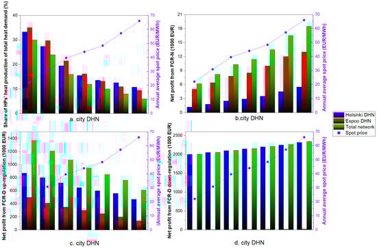 (a) Proportion of annual heat production by HPs in each city’s DHN relative to its annual heat demand, under varying electricity spot prices. Cumulative annual net profit for each city’s DHN in: (b) FCR-N, (c) FCR-D up-regulation, and (d) FCR-D down-regulation markets.