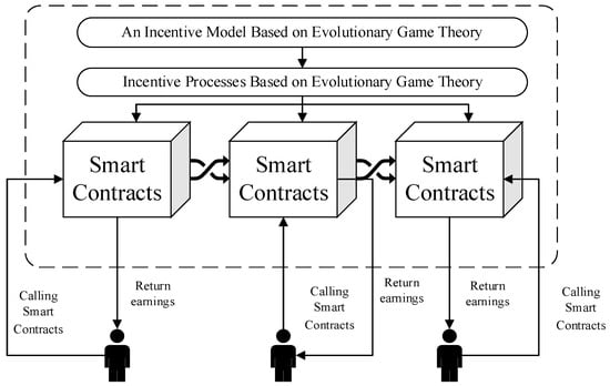 The model function can be divided into two parts: the data-sharing incentive mechanism based on evolutionary game theory and the design of a smart contract based on an incentive mechanism. An evolutionary game model is established between data users and analyzed to stabilize the evolutionary strategy, and a smart contract is designed to dynamically adjust the incentive benefits of user participation in sharing.