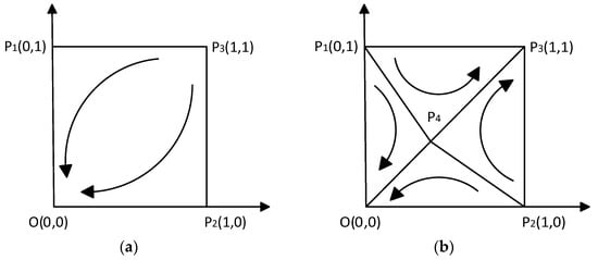The phase evolution diagram is shown in Figure 3b. Data users choose to share or not share data depending on the initial state of the system, linking the points in the figure; when the initial state of both data-sharing parties falls below, after evolution, the system will converge to point O, which indicates the strategy where the sharing parties will tend to choose not to share data; when the initial state of both sharing parties falls above, after evolution, the system will converge to point , which indicates the strategy where the sharing parties will tend to choose to share data. The area of the region surrounded by points can be used to indicate the probability of user participation in sharing.