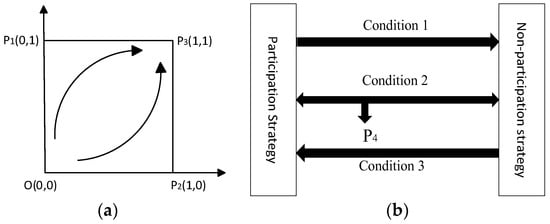 Evolutionary game theory (EGT) is an important mathematical tool for studying and analyzing individual behavior and strategic choices in social systems. Evolutionary game theory is the study of a particular group of people changing over time. The purpose of the theoretical inquiry is to understand the dynamic process of group evolution and to explain why the group will reach this current state and how it will get there. In evolutionary game theory, individuals are assumed to be rational, pursuing their own interests and interacting with others by choosing different strategies []. In evolutionary game theory, there is a core concept called the “Evolutionary Stable Strategy” (ESS), which is similar to the Nash equilibrium in traditional game theory, but emphasizes the long-term stability of individual strategies in the evolutionary process. Evolutionary game theory focuses on dynamic equilibrium, while general game theory focuses on static equilibrium and comparative static equilibrium. Evolutionary game theory also introduces the concept of replicator dynamics (RD) and a mathematical model of competitive growth dynamics. Replicator dynamics provides a way to understand the evolutionary trend of individual strategic choices from a population level perspective. By analyzing the results of the replicator dynamics model, we can predict the change in the frequency of different strategies in a population over time, thus revealing the evolutionary trend of population behavior. The mathematical model of competitive growth dynamics, on the other hand, can use differential equations to describe the trend of rational behavior of individuals in a population, further revealing the dynamic changes in the evolutionary process [].