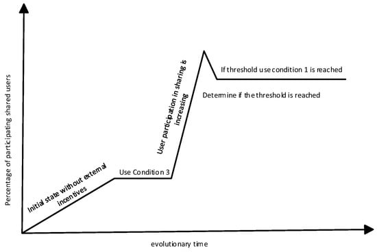 Firstly, in the initial stage of the whole evolutionary gaming process, the proportion of users in the system who choose to participate in data sharing as a whole is small; according to the analysis, using Condition 3, the proportion of participating users can be increased by improving the subsidy coefficient, increasing the size of the shared data, and reducing the cost to incentivize more users to turn to the participation strategy. Once the proportion of users participating in data sharing exceeds a certain threshold, i.e., the state of point, users can spontaneously participate in data sharing without additional incentives from the system. When the current incentive ratio has reached the maximum before the end of a round of the game, the system can spontaneously determine whether it is necessary to use Condition 1, and reduce the proportion of users participating in data sharing in the system at this time by increasing the cost or reducing the subsidies in the system to make the users choose not to participate in data sharing after the evolutionary game; at this time, the blockchain data-sharing platform, with the increasing proportion of sharing users, may bring additional costs to users, and, as the proportion of shared users rises, it may lead to higher loads within the system, resulting in higher maintenance costs. Therefore, it is necessary to dynamically reduce the proportion of partially shared users to ensure that the benefits of the entire system are maximized.