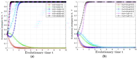 Data-sharing size is also an important parameter that affects the user’s benefit; the larger the data shared between the two sides, the more the benefit. In the control of other parameters remaining unchanged, change the parameter E to determine the data complementarity on the evolution of the game stabilization role; the results are shown in Figure 6b. The other parameters assigned specific values are as follows: . The initial user sharing ratio in the system is set to 0.3.