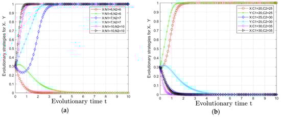 Considering that credibility in the calculation of user benefits is an important means to ensure safe sharing, in the control of other parameters remaining unchanged, change the parameter N to determine the impact of user credibility on the stable evolution strategy; the results are shown in Figure 7a. The other parameter assignments are as follows:
