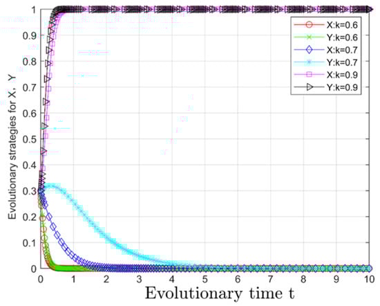 The factors discussed above are all fixed values, and, when the user sharing cost is greater than the above benefits, a certain amount of subsidy must be given by the platform to incentivize users to share data. Under the control of other parameters remaining unchanged, change the parameters k to determine the impact of platform subsidies on the evolution of the game strategy; the results are shown in Figure 8. The other parameters are assigned as follows: . The initial user ratio in the system is set to 0.3.