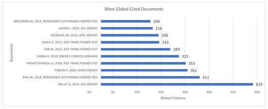 The most cited document, published in 2010, by Mellit and Pavan [45] proposed a method for solar irradiance forecast using an artificial neural network (ANN), taking into account the importance of planning the operations of power plants. Another interesting outcome is that two of the five first most cited documents are reviews, one related to photovoltaic power generation forecasting and model optimization [46], and the other one pursuing the objective of giving a comprehensive and extensive review of renewable energy forecasting methods based on deep learning [21].
