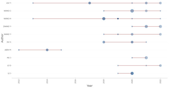Top 10 most relevant authors’ production from 2012 to 2022 (red line: the author’s timeline, bubble size: the number of publications, bubble color intensity: total citations per year (by Biblioshiny for bibliometrix).