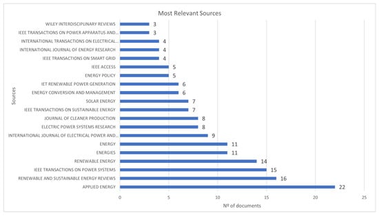 The selected articles were distributed into 86 sources. A previous conclusion is that we have a spread-out database. However, 69% of the articles were concentrated in the top 20 sources, and the top 10 account for 50%. Figure 5 presents the most relevant sources: Applied Energy represents 9%, followed by Renewable and Sustainable Energy Reviews with 7%.