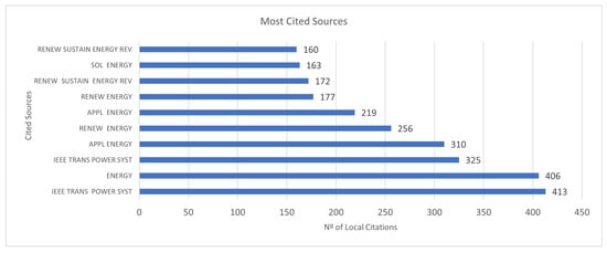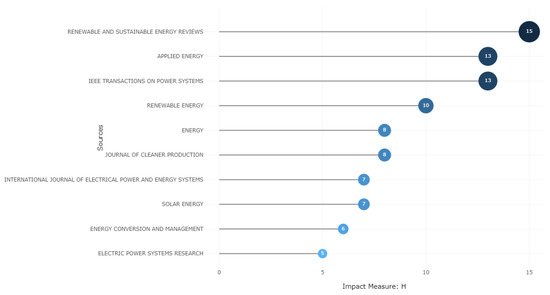 Figure 6 brings the top 10 most cited sources, the three first journals are IEEE Transactions on Power Systems, Applied Energy, and Renewable and Sustainable Energy Reviews. Figure 7 displays the h-index; this index is used to compare the productivity and impact of the sources. Renewable and Sustainable Energy Reviews, Applied Energy, and IEEE Transactions on Power Systems are the sources with the highest index.