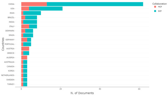 Figure 10 demonstrates the top 20 countries ordered according to their scientific productions. The red bar corresponds to publications rate in the author’s country when there is also a foreign co-author (MCP—multiple countries publication). The blue bar represents single country publications (SCP).