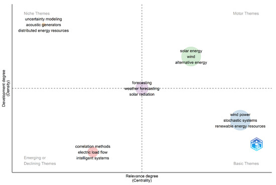 The purpose of this analysis is to identify the main topics related to renewable energy correlated scenario generation; to achieve these objectives, keyword networks were employed. The co-occurrences among the document’s dataset are represented by keywords networks. Using the Bibliometrix software, a thematic map was plotted. This map is capable of representing each theme by clustering the keywords network. Centrality and density show the theme importance and theme improvement in the research area. The bubble size is relative to the cluster word occurrences, and its position depends on the cluster centrality and density. Therefore, highly developed and isolated themes are on the top left, motor themes are on the top right, emerging or declining themes are on the bottom left, and primary and transversal themes are on the bottom right of the thematic topic map. The thematic map analysis, Figure 11, shows that the solar energy/alternative energy keywords theme is the most important theme with the highest centrality, the themes related to solar power generation forecasting and stochastic system placed at the bottom left of the map could be classified as emerging themes.