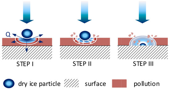 Pollution-removing mechanism: step I—cooling, step II—crushing, step III—sublimation and pollution transport with the gas flow (Adapted with permission from Ref. [13], 2021, Energy).