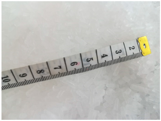 From the thermodynamics point of view, all carbon dioxide liquid has to be transformed into a solid and be treated in conditions maintaining the solid state of the CO2. Practically, CO2 fluid at a temperature of −20 °C and under pressure at 12–20 bars goes though the throttling valve to decrease the pressure to 1 bar. In this process, the carbon dioxide temperature decreases to −78.5 °C, in which its solidification occurs [12]. This form is called CO2 snow. Then the desired form of the solid particles has to be produced. Usually, this step takes place in a pelletiser machine in which the snow is being pressed at the low temperature, generating pellets with a diameter in the range from 3 mm to 5–10 mm (Figure 3) [21]. The material hardness in a Mohs scale reaches approximately 1.5 [24].