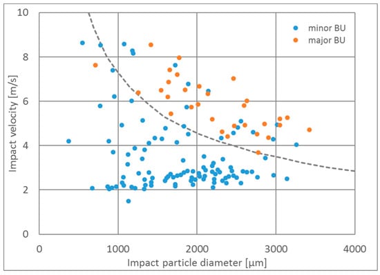while assuming manufacturing pressure to be 100 bar and using . It can be summarised that the particle breakup energy depends only on its initial diameter. Depending on the particle size and the velocity vector normal to the wall, two main scenarios were identified: minor and major particle breakup. Minor breakup was noted under low velocity impact. In this case, among secondary particles, one main particle at the diameter comparable to the primary particle was observed associated with a small number of small secondary fragments. Major particle fragmentation occurs when the velocity vector normal to the wall is significant. This breakup is characterised by numerous secondary particles of comparable diameters—noticeably lower than the primary particle dimension. Minor and major breakup regions for particle impact velocity and diameter are presented in Figure 4. Although in [31] the detailed breakup model is presented and supported by experimental data, there are no bench test data on the amount of dry ice sublimated during the decomposition. The author confirmed that his work in this field is only theoretical and that further research is needed.