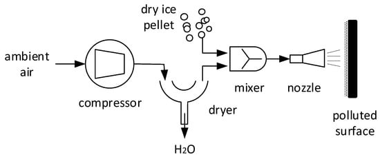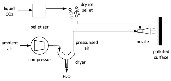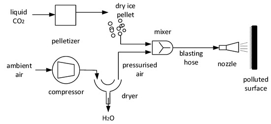 In the most common dry-ice-blasting systems, the first step is air compression and drying. Dry ice in the form of pellets is then loaded into a shredder, where it is mixed with the air. The final step is the nozzle, in which the mixture reaches the desired velocity and goes straight onto the polluted surface. Dry ice can be produced in a separate system [23,40] or on site [25]. In such a case from liquid CO2, dry-ice pellets are created in the blasting system. Then, compressed air takes solid particles through the hose and nozzle to finally deliver the high-speed blasting medium to the polluted surface [41] (Figure 5).