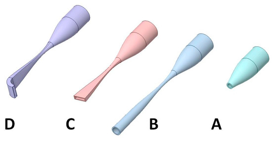 Then nozzles can be divided by the channel shape. Examples of them are presented in Figure 8. As the manufacturers of the blasting systems scarcely provide inner canal dimensions, only an outside view of the nozzles is presented. Despite that, it should be mentioned that a wide range of shapes is available in the market, depending on the desired cleaning parameters.