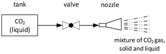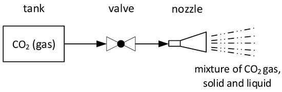 Another system using dry ice as a blasting medium is snow blasting. In this case, solid carbon dioxide is generated in the cleaning system by pressurised gas or liquid throttling. Thanks to the Joule–Thompson effect [60], during the expansion, the medium partially solidifies and/or liquefies. Snow-blasting-system schemes are presented in Figure 9 and Figure 10. In this system, no auxiliary air is demanded, although in some systems, compressed air support can be met [61].