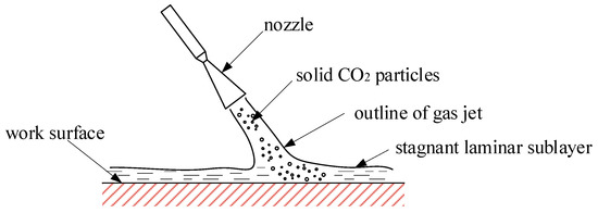 There are various phenomena related to pollution removal during the abrasive surface treatment with solid CO2 particles. The process is based on pollution removal through the sped-up air and dry-ice mixture. The dry-ice blasting cleaning mechanism is based on three main phenomena: the thermal effect (cooling), abrasion using flow kinetic energy, and sublimation [7]. During the first one, the mixture reaches the dirty surface and cools it down [8], which contributes to the pollution’s cracking [9]. Then dry-ice particles sublimate, which causes local volume growth (by a factor of 800 [10,11]) and the pollution crush. The cooling effect is caused by two phenomena: (1) convection due to surface washing in the stream of high-speed, cold gases and (2) sublimation. Sublimation heat from dry ice equals to 573 kJ/kg. Assuming dry-ice effective mass flow (mass flow of the dry ice which leaves the nozzle, so it hasn’t been sublimated in the devices) at the level of 30 kg/h and an interaction surface of 0.00025 m2 (example nozzle outlet), the heat flow resulting from sublimation equals to 19.1 MW/m2. Finally, the impurities are entrained by the air stream. As the abrasive medium sublimates, the only waste consists of the impurities present in the pollution layer. The CO2 in the gaseous form leaves the cleaning zone. The blasting mixture force in the cleaning surface area consists of three components: force related to pressurised air impact, force caused by high-speed dry-ice particles clashing, and force generated by the rapid volume growth of sublimated particles [12]. The dry-ice cleaning mechanism scheme is presented in Figure 2.