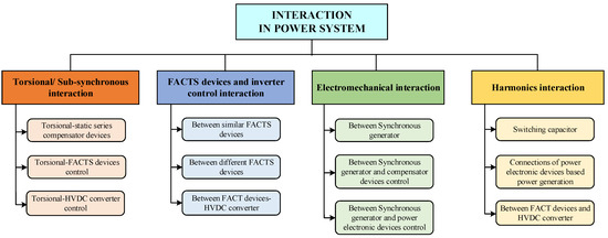 Modern power systems mostly operate under stressed situations due to the variations of load profiles, heavy transmission line loading conditions, and economy of operation [63]. Moreover, increasing penetration of RE-based power generation also introduces novel challenges to dynamic system behaviour, potentially leading to interactions. The power system interaction is the interaction that emerges in the different modes in power systems. Power system interactions may occur due to coupling among torsional modes, control modes of compensator devices, electromechanical modes of synchronous generators, control modes of RE-based DG units, and harmonics components [64]. The interactions introduce detrimental effects on system stability and power quality, such as low stability margin, reduced power transfer capability, and amplification of harmonic distortions. The classification of interactions in the power system is depicted in Figure 5.