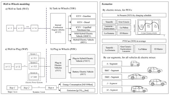 This section proceeds as follows. First, the methodology and literature review are presented. Second, the energy context of the Canary Islands is described and the current and medium-term (2030) energy scenarios are detailed. The electricity mixes are crucial in determining the impacts of PEVs on energy consumption and emissions, as revealed in the results section. The WtW modeling and the different scenario pathways are then presented. Finally, the car sales on the Canary Islands were used to build a car inventory.