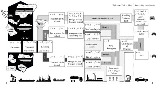 Figure 3 details the energy pathways for each vehicle and the processes covered from the well of the energy source to the vehicle’s wheels (given that 96% of the primary energy sources in the Canaries are oil based). In Figure 3, each step (s) of the process and each emission focus (f) are shown along the pathways.