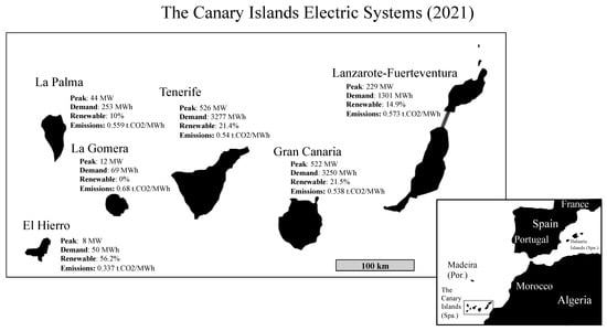 In 2021, the Canary Islands depended on petroleum-derived fuels for 96% of its primary energy supply, making the energy transition toward decarbonization a daunting task [11]. Although the electrification of all fields is crucial to push renewable energies, the island’s current electricity sector only accounts for 20% of its final energy consumption. Within this percentage, only 20% was from renewable facilities in 2021 [31]. Therefore, the remaining electricity (80%) came from oil-derivate fuels (specifically fuel oil and diesel oil), causing overruns and a high rate of emissions (nearly four times over that of continental Spain) [32,33]. Furthermore, the Canary Islands has six isolated electric power systems, differentiated in size and characteristics according to the particularities of each island (Figure 4). The systems with the largest rate of renewables are El Hierro, Gran Canaria, and Tenerife, accounting for 56.2%, 21.4%, and 21.5%, respectively. The high share of renewables in these systems is explained by the operation of pumped hydro storage. For the remaining systems, renewable participation ranges between 21% and 10%, except for La Gomera (which is without a large renewable installation) [34,35].