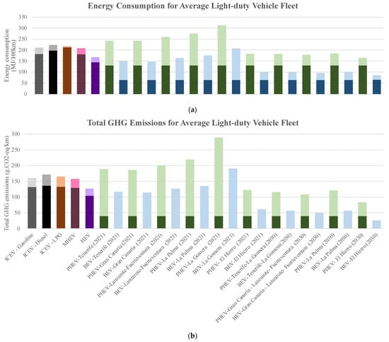 Results of the WtW impacts in the average scenarios for an average vehicle. The darkest portion represents the WtT or WtP impacts and the lightest shows the TtW or PtW impacts: (a) energy consumption; (b) GHG emissions.