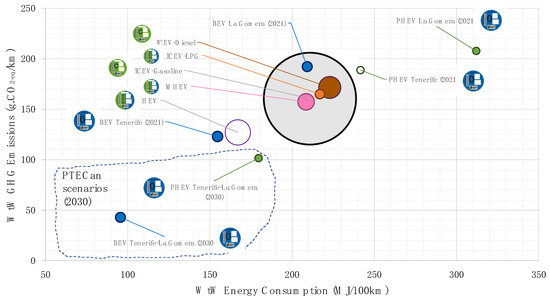 The transition to a decarbonized mix is one of the most important efforts to take place this century. The Canary Islands are not alien to this transformation and have an ambitious project to decarbonize the islands by 2040. The preliminary PTECan document proposes an intermediate objective of above 60% renewables in the Canary Islands mix by 2030. In addition, a set of interconnections between islands is projected, for example, Tenerife–La Gomera (2025) or the systems of Gran Canaria and Lanzarote and Fuerteventura (2030). The most relevant WtW scenario results (see Table 9) related to the PEV fleet considered in this study are detailed below.