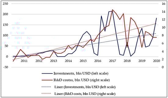 Long-term investments and R&D costs of the selected ten companies operating in the renewable energy field in 2011–2020, bln USD (Source: constructed by author).