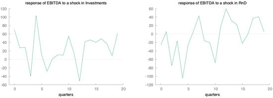 The responses of the dependent variables to the shocks of the independent variables are shown in Figure 3. We can argue that financial indicators do not affect the number of investments and R&D costs based on the obtained data. It can be explained by the fact that investments and R&D are carried out not based on indicators of past activity but on a prospective assessment of the development of the market and companies.
