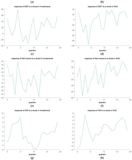 Responses: (a)-EBITDA, (c)-EBIT, (e)-Net Income, (g)-ROI on shocks in Investments and (b)-EBITDA, (d)-EBIT, (f)-Net Income, (h)-ROI on shocks in Research and Development Expenditures (Source: constructed by author).