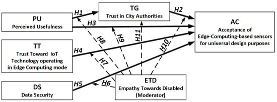 In his research, Oliveira Neto showed that more than half of the surveyed residents of the city of Sao Paulo feel empathy toward people with disabilities and believe that the city should be adapted to their needs. The author claimed that city authorities should take this into account. The author did not present a structural model and did not prove the relationship between empathy and the acceptance of the use of IoT technologies in smart cities [25]. The model presented in this article combines different models’ functionalities. The perceived usefulness dimension (PU) is taken from the TAM model, and trust in city authorities (TG), trust in IoT devices (TT) and perceived data security (DS) were taken from other studies regarding IoT security and empathy. No similar model assessing the acceptance of the use of Edge Computing data from IoT devices for universal design was found in the literature, so a hybrid model based on the TAM model, surveillance acceptance models, empathy models and the IoT acceptance model for disability needs was created [39].