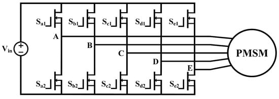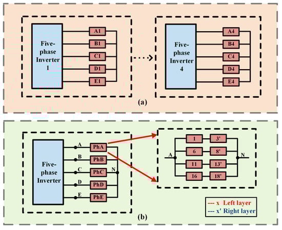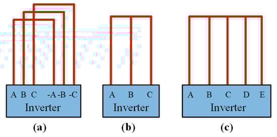 Figure 3 demonstrates the motor winding connection for both types of motors. The five-phase single-turn windings are divided into four isolated groups of TLS structure. Each group connects with the five-phase inverter to improve the reliability of the system. The traditional five-phase distributed PMSM has four parallel branches in each phase, and the winding connection is shown in Figure 3b.