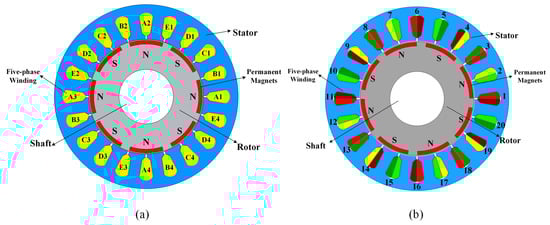 (a) Two dimensional topology of five-phase single-turn PMSM. (b) Two dimensional topology of conventional distributed five-phase PMSM.