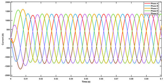 The overall driver layout of a five-phase single-turn motor is shown in Figure 4. Maxwell 2D, Simplorer, and Simulink are used for coupled simulation. The power circuit is built in Simplorer software, and Maxwell 2D is used for magnetic analysis. The SPWM algorithm is adopted to produce a five-phases sinusoidal current waveform, and the control circuit is built in Simulink. Figure 5 shows the five-phase current waveform of SPWM.