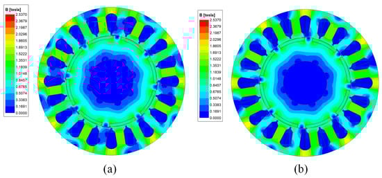 Magnetic flux density cloud map under full load condition. (a) Single-turn winding distribution. (b) Double-layer winding distribution.