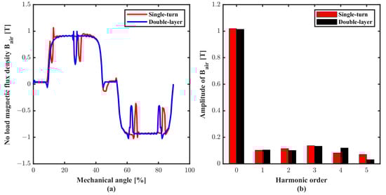 Figure 6 shows the no-load magnetic flux density distribution of both winding structures. As can be seen, the magnetic bridges for both winding structures are saturated, which constrains the flux leakage. Moreover, the flux distribution of both winding is almost the same, indicating that single-turn winding can effectively utilize the magnet material as the conventional winding structure. The no-load magnetic flux density distribution along air gap and its harmonic component are shown in Figure 7. The air gap flux distributions are almost the same since both winding structures have the same magnet thickness and distribution. The difference between winding structures does not affect the performance under no-load conditions.