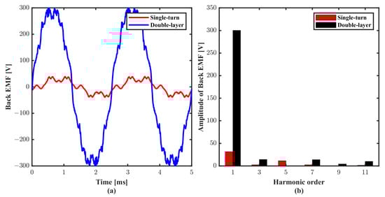 The no-load back EMF waveform is presented in Figure 8. It can be seen that the back EMF amplitude of double-layer winding is significantly larger than the single-turn motor because multi-turns in each phase are wound around the tooth for double-layer winding distribution. In addition, the back EMF of a double-layer structure has a very low harmonic component, and the total harmonic distortion (THD) is 8.9%, which means double-layer winding has a high winding factor and better utilization of current excitation. In contrast, the amplitude of back EMF for the single-turn motor is only 40 V since only a single-turn is present around the stator tooth. Furthermore, a single-turn motor has an abundant five-order harmonic component in the back EMF waveform, and the THD is 38.6%, which causes the flux linkage and back EMF to be distorted.